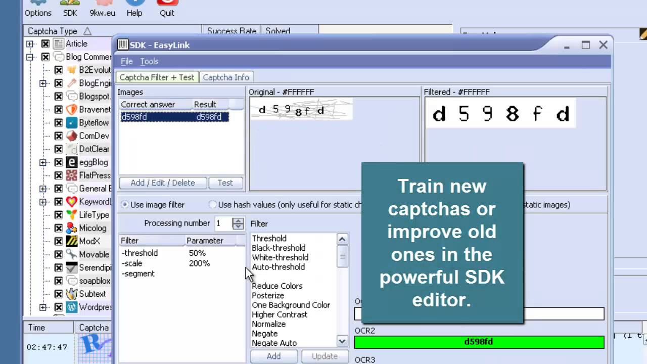 GSA Captcha Breaker is the revolutionary breakthrough software that effortlessly analyses and solves captchas for you. After you get GSA Captcha Breaker, you won’t need to type in captchas manually or pay others to solve them again.
